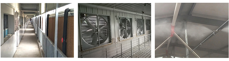 | Although ventilation is an effective means of cooling, it can only reduce the temperature to near ambient temperature. At present, the cooling system commonly used in pig farms includes wet curtain fan cooling system, spray cooling system, and dripping water cooling system. The wet curtain fan cooling system is currently the most mature evaporative cooling system. Its evaporative cooling efficiency can reach 75% - 90%, and has been widely used all over the world. |