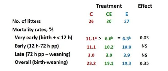 Early mortality (i.e., piglets dead at birth + piglets that died within 12 hours of birth) was lower in groups CE and E (6.6% and 6.3%, respectively) than in group C (11.1%, P < 0.05), but overall mortality (stillbirth + preweaning death) did not differ significantly among the 3 groups (23.2, 19.1 and 19.3% in groups C, CE, and E, respectively, P = 0.35) (Figure 2). |