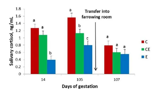 | Study design The study aimed to investigate a strategy of environmental and nutritional enrichment to reduce maternal stress and its consequences on piglet mortality. Gestating sows were group-housed in a conventional system on a slatted floor (C, n = 26), in the same conventional system with environmental and nutritional enrichment (CE, n = 30) or in larger pens enriched with straw bedding (E, n = 27). The enrichment of the CE group consisted of pieces of oak attached to a chain (three per pen) and straw pellets provided in the trough at a rate of 200 g/day from 3-30 days of gestation (DG) and 400 g/day from 31-104 DG. On DG 105, sows were transferred into farrowing pens and housed in identical individual stalls on a slatted floor. Researchers measured cortisol concentration — an important indicator of stress — during gestation. They also recorded sow behavioural and investigative activities as well as piglet mortality. Results Results indicate that maternal stress and mortality were inversely correlated with the level of enrichment. Cortisol concentration was greater (P < 0.05) in the C and CE sows than in E sows on DG 14. On DG 105, it was intermediate in CE sows compared with C and E sows (before transfer to farrowing pens), and no longer differed among the 3 treatments on DG 107, after the transfer (Figure 1). |