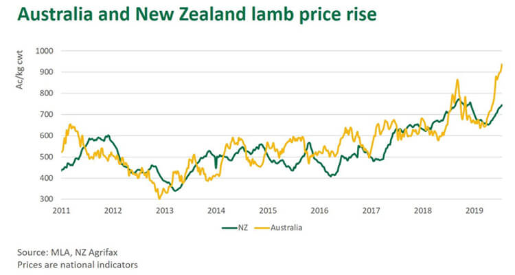 Australian sheepmeat exports had their strongest financial year on record, with lamb shipments (275,000 tonnes swt) hitting an unprecedented volume and mutton (188,000 tonnes swt) rising to levels not seen since the wool crash three decades ago. However, ongoing and widespread drought and elevated slaughter was the primary driver of increased shipments and now attention is turning to the damage incurred upon the national flock. As highlighted in the recent Sheep Industry Projections June Update, a reduced number of ewes joined is expected to hinder the 2019 spring lamb crop. While some parts of South Australia and Victoria have had some decent winter rainfall, many regions are still awaiting a decent seasonal break – the failure of which will slow down the finishing of lambs.