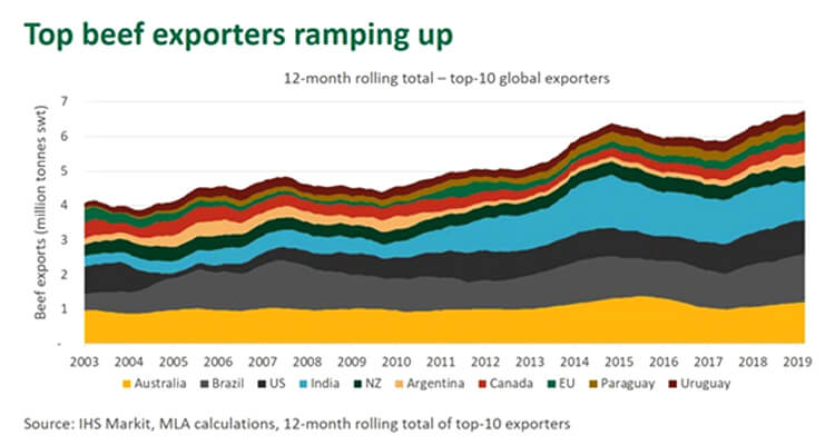 As highlighted below, on a twelve-month rolling basis, the top-10 largest exporters sold 6.74 million tonnes swt of beef onto the global market over the last twelve months – an extra 400,000 tonnes swt, or 6%, compared to a year earlier and 840,000 tonnes swt compared to two years ago. Furthermore, of the top-10 largest exporters, only India and Paraguay recorded a contraction in beef exports over the most recent twelve months of available data. Argentina led export growth (up 64% year-on-year) amid a collapse in the local currency and a relaxation of export controls, while the US (up 5%), Brazil (up 15%), Canada (up 12%), New Zealand (up 8%), Uruguay (up 2%) and the EU (up 1%) all joined Australia in an export expansion. Reflecting this growth, the USDA have estimated a record 17.3% of global beef production will be traded internationally in 2019, up from 13.2% in 2010.