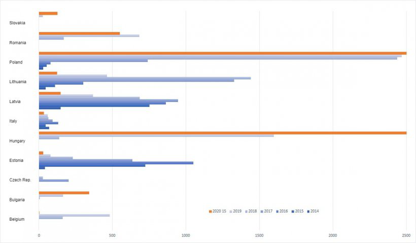 In contrast, outbreaks of ASF in domestic pigs have decreased compared to the year prior. So far this year, 346 outbreaks have been confirmed, almost all of them in Romania (321). However, it should be noted that the number of confirmed outbreaks in this country is increasing at slower pace compared to 2019, taking into account that, out of all the 1,848 outbreaks confirmed in domestic pigs for the entire EU in 2019, 1,724 were from Romania.
