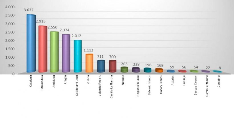 Of the 53,105 farms registered in the REGA (General Register of Livestock Holdings), 17,060 fall into this OTE (32.12%). The largest number is found in Catalonia, followed by Extremadura and Andalusia (Figure. 1).