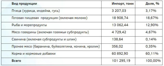 Finished food products were imported 18.91 thousand tons (18.67%), fish and seafood - 13.06 thousand tons (12.90%).