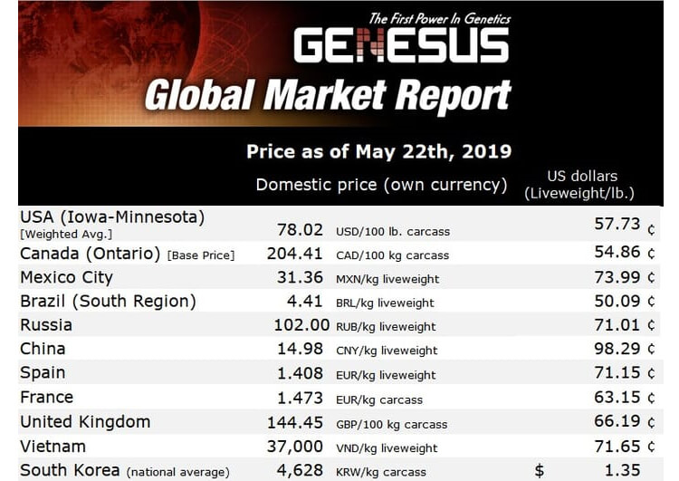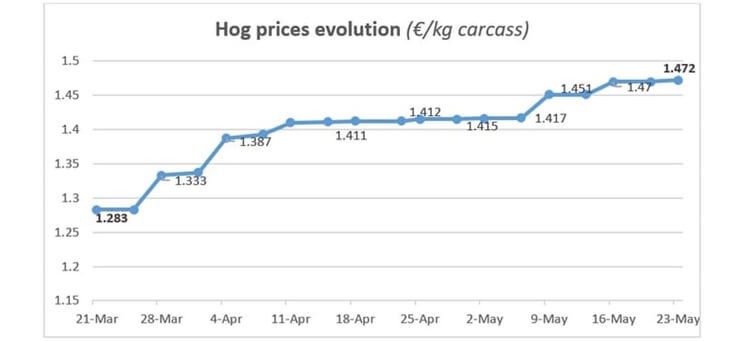 Hog market: the price increase continuesThe rise in prices started in early March continues in France and in European countries, following African swine fever (ASF) outbreak in China and Asia, important producers and consumers of pork. Over the last 2 months (from 21 March to 23 May) the hog price has increased by 15 percent from 1,283 € to 1,472 € per kg carcass, a gain of about 18 € (20,14 US $) per head. |
