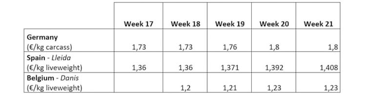 Over this period, same observation with the price of the piglets: + 27 percent for 8 kg weaned piglet with a price of 29.15 € (32,6 US $) per head and + 34 percent for a 25 kg piglet (2,07 US $ € per kg liveweight instead of 1.54 $ in March). No exception with culling sow price who is at 1.033 € (1,156 US $) per kg, an increase of 31 percent compared to the end of March. This price increase should continue and prices could reach record levels, while remaining at high levels for at least two years; the time that China is recovering from the brutal liquidation of its breeding stock and a decline in production estimated between 25 and 35 percent according to Rabobank. Good prospects for hog producers! And in the other European countries? Same scenario: |