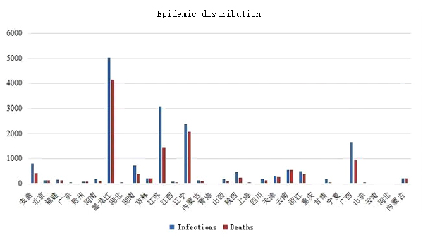 Distribution of African swine fever in China