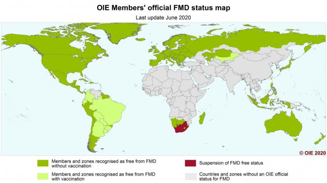 Croatia, Kazakhstan, and Malta have been recognized as free from classical swine fever. One zone in Chinese Taipei (Taiwan) has been declared free from foot and mouth disease where vaccination is not practiced. Brazil (one zone) and Colombia (four zones) have been declared free from FMD as well, but where vaccination is practiced.