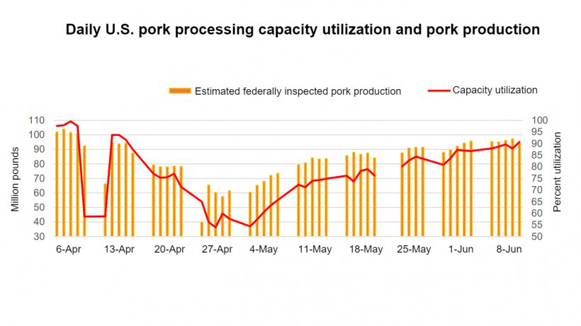 U.S. pork processing capacity utilization increasing as COVID-19-related disruptions recede