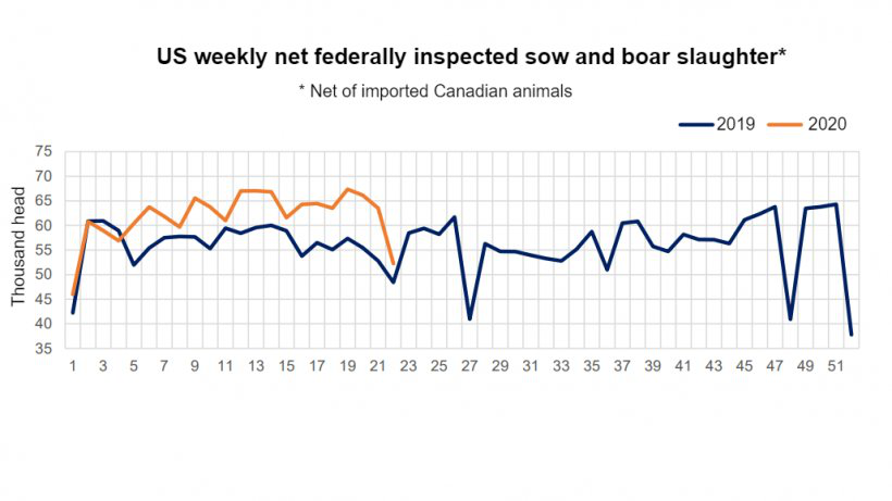 In the first 22 weeks of 2020 (between the week ending January 4 and the week ending May 30), sow and boar slaughter averaged almost 62,000 head per week, more than 10 percent above the same period a year ago. Since the week ending April 11, when COVID-19-induced interruptions in the processing sector began to occur, sow and boar slaughter accelerated. Between the week ending April 11 (week 15) and May 30 (week 22), slaughter of breeding animals averaged about 63,000 head per week, almost 15 percent above the 54,800-head average for the same period in 2019.